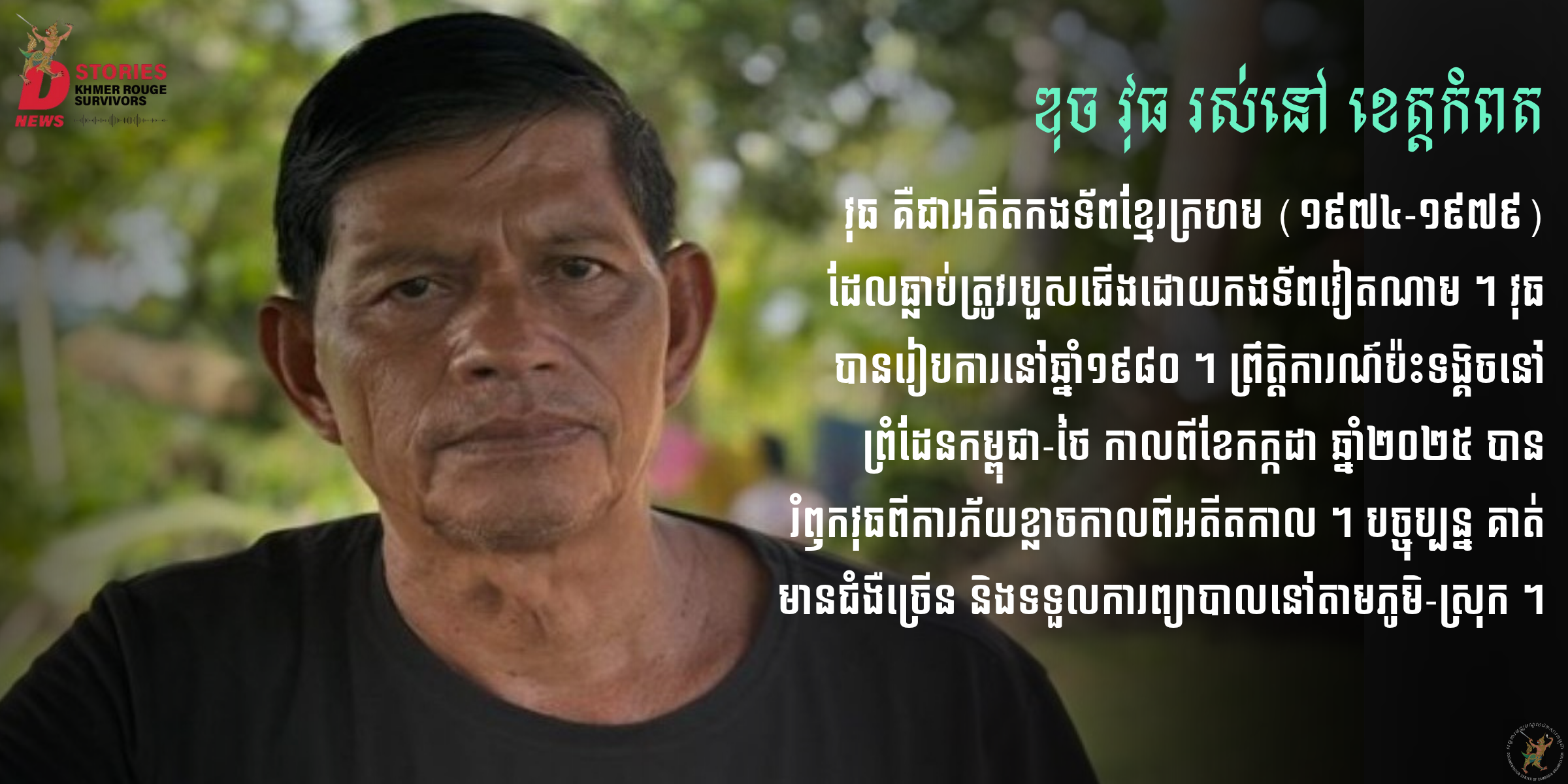 [1] ឌុច វុធ៖ សម្ភាសន៍ផ្ទាល់មាត់«ប្រជាជនរស់នៅតំបន់បាក់នឹមស្តីពីការ ការប៉ះទង្គិចនៅតាមបណ្តោយព្រំដែនកម្ពុជា-ថៃ និងស្ថានភាពសុខភាពបច្ចុប្បន្ន»សម្ភាសន៍ដោយ ៖ ផាត ពន្លក នៅខែសីហា ឆ្នាំ២០២៥,មជ្ឈមណ្ឌលសះស្បើយសហគមន៍បាក់នឹម មជ្ឈមណ្ឌលឯកសារកម្ពុជា សាខាខេត្តកំពត