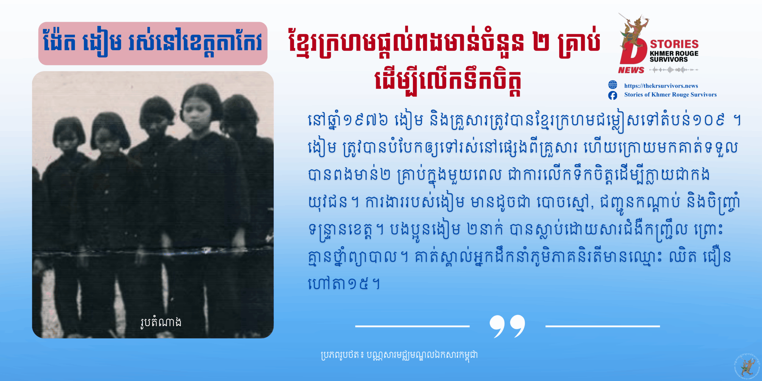 [1] ឯកសារលេខ D25133, ង៉ែត ងៀម (កុមារកងទ័ព), សម្ភាសដោយ គឹម កែវកន្និដ្ឋា, នៅថ្ងៃទី១១ ខែមិថុនា ឆ្នាំ២០០១, បណ្ណសារមជ្ឈមណ្ឌលឯកសារកម្ពុជា។