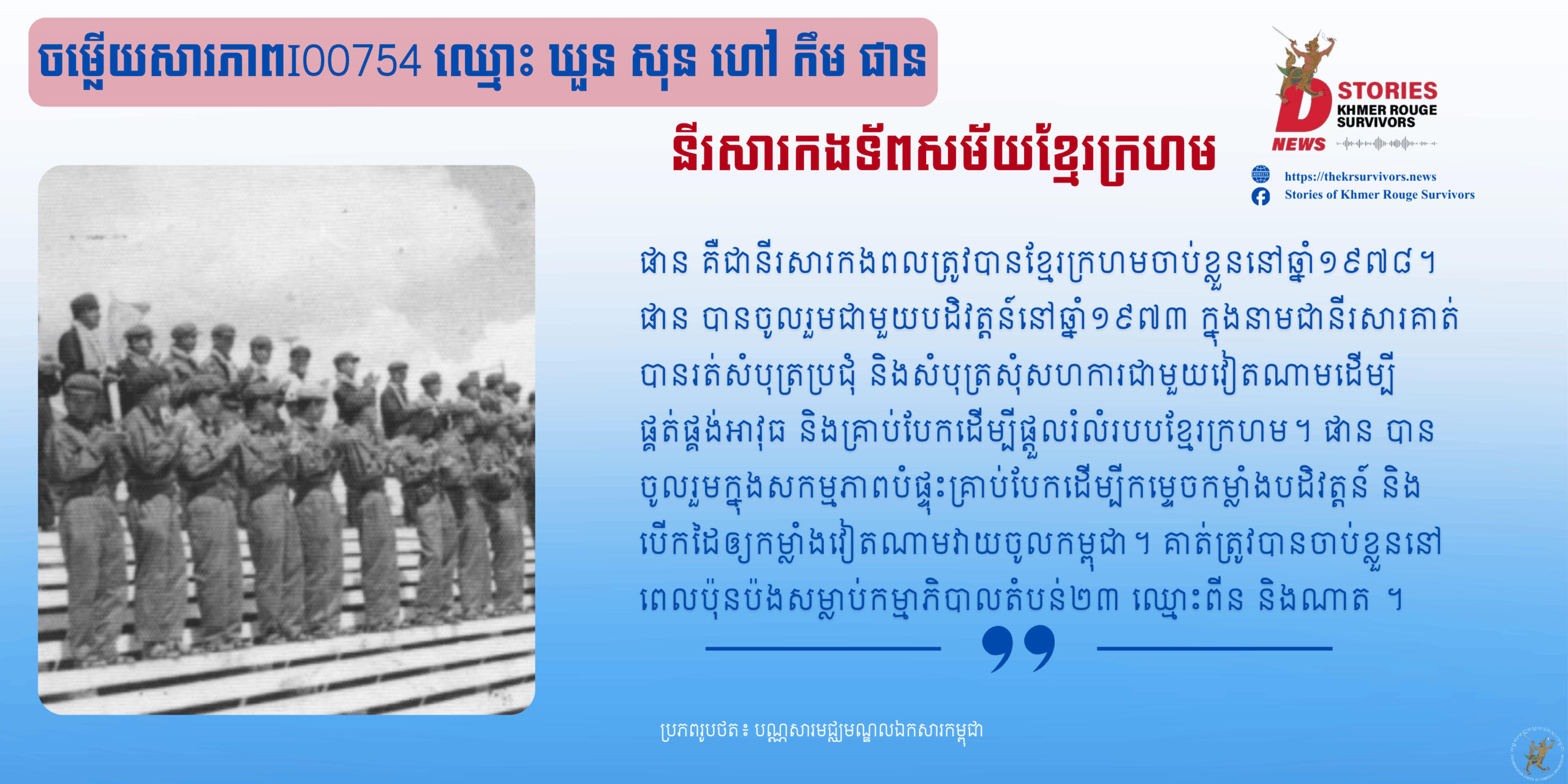 [1] ឯកសារ I00754 ចម្លើយសារភាពរបស់ ឃួន សុន ហៅ កឹម ផាន នាទីជានីរសារកងពលតំបន់២៣ នៃភូមិភាគបូព៌ា។ ក្នុងចម្លើយសារភាពក៏មានហត្ថលេខារបស់ឌុចដែលជាប្រធានស-២១ «បងជាទីគោរព, អានេះ [ឃួន សុន ហៅ កឹម ផាន]  វាចូលទៅប្រុងបោកគ្រាប់បែក កន្លែងបងពីនវេលាម៉ោង១២យប់។ មានរាយការណ៍ជូនអង្គការម្តងហើយជាកំណត់ហេតុ។ ចម្លើយលម្អិតលើកនេះក៏មិនជាស៊ីជម្រៅប៉ុន្មាន។ វានិយាយត្រឹមតែវាជានីរសាររត់សំបុត្រ និងរត់ពាក្យរបស់មេៗ និងទាំងយួនទាំងទៅខាងខ្មែរ»​ និងចុះកាលបរិច្ឆេទនៅថ្ងៃទី២៧ ខែមីនា ឆ្នាំ១៩៧៨។ ឯកសារនេះជូនបង៨៩ ពីរច្បាប់ហើយ។ ក្នុងចម្លើយសាររភាពរបស់ផាន មានចំនួន២៨ទំព័រ បានទម្លាក់កំហុសលើកម្មាភិបាលតំបន់២៣ ប្រមាណ៤៦នាក់​។ អង្គការបានចាប់ខ្លួន និងសួរចម្លើយ ផាន ចប់នៅថ្ងៃទី២៤ ខែមីនា ឆ្នាំ១៩៧៨ ដោយឆ្មាំគុក ឈ្មោះផូ​។