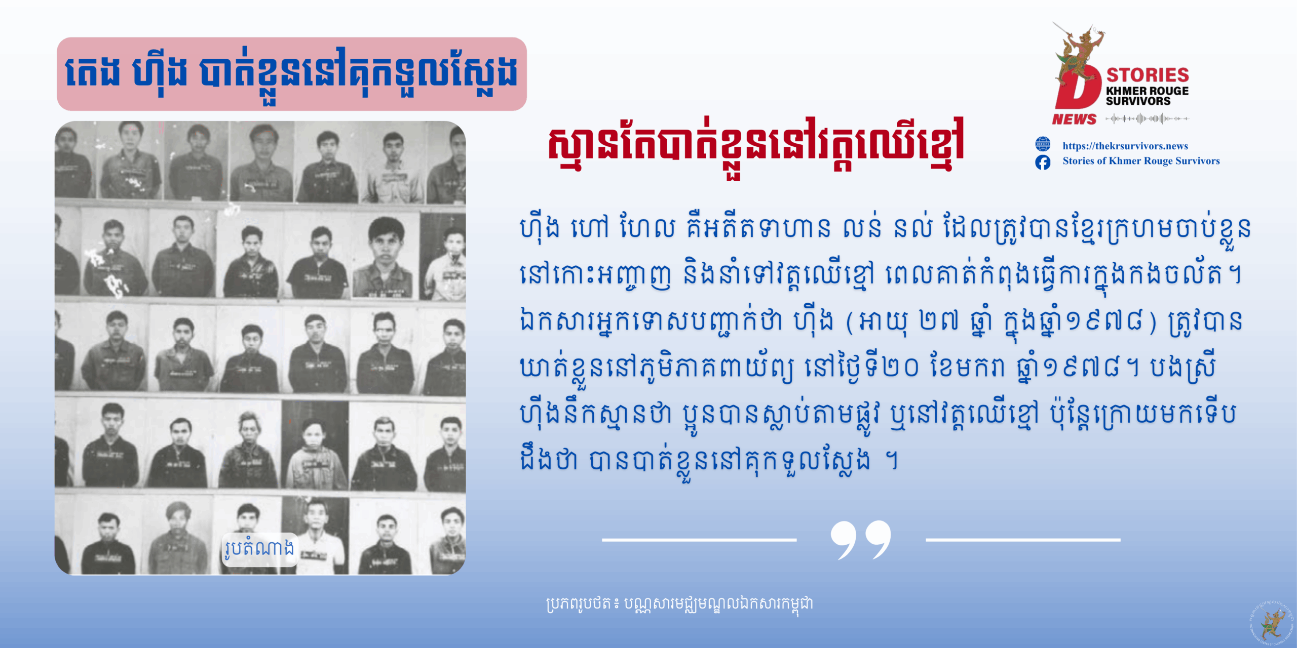 នៅឆ្នាំ១៩៧៩ បន្ទាប់ពីរបបខ្មែរក្រហមដួលរលំ ម្ដាយមីងបានមកប្រាប់ថា បងស្រីរបស់ហ៊ីង ថា ហ៊ីង ត្រូវបានខ្មែរក្រហមនាំឡើងកាណូតទៅវត្តឈើខ្មៅ និងបាត់ដំណឹងតាំងពីពេលនោះមក។ ក្រោយពីសម្ភាសជាមួយបុគ្គលិកមជ្ឈមណ្ឌលឯកសារកម្ពុជា ទើបបងស្រីហ៊ីង ដឹងថា ហ៊ីង ត្រូវបានបាត់ខ្លួននៅគុកទួលស្លែង។ បងស្រីហ៊ីង និយាយថា «ខ្ញុំស្មានតែគេសម្លាប់នៅតាមផ្លូវ»។ គាត់បន្តថា «មិននឹកស្មានថាគេយកទៅដល់ទួលស្លែងហ្នឹងផង អ្នកខ្លះភាគច្រើនគេសម្លាប់នៅវត្តឈើខ្មៅហ្នឹងឯង»។