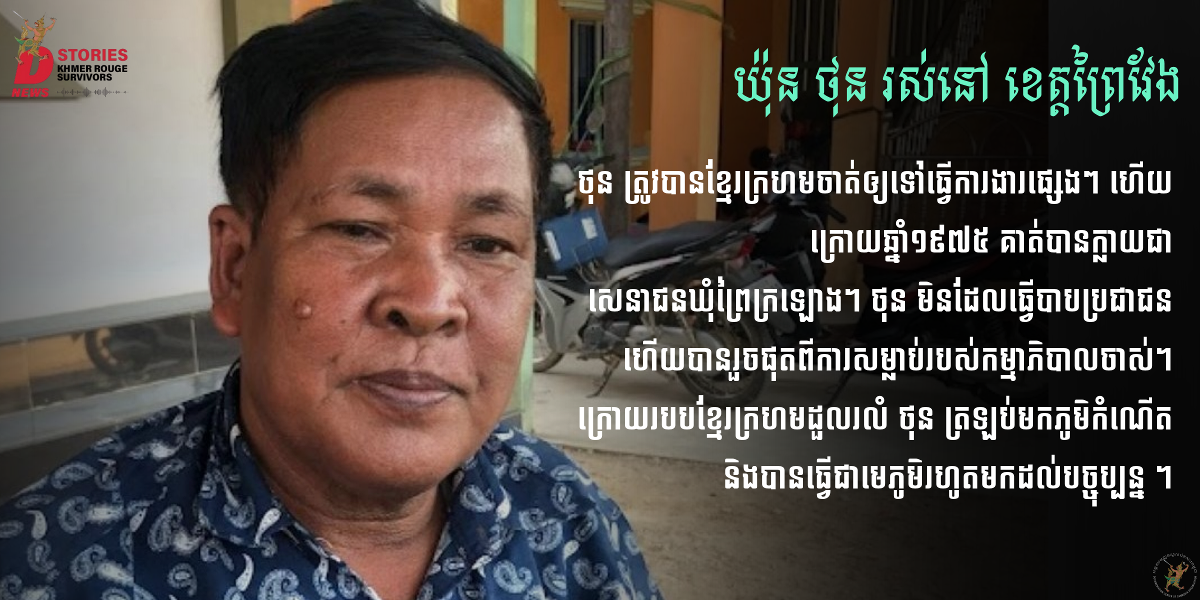 [1] មជ្ឈមណ្ឌលឯកសារកម្ពុជា, កិច្ចសម្ភាសជាមួយឈ្មោះ យ៉ុន ថុន អាយុ៦៤ឆ្នាំ នៅខែមេសា ឆ្នាំ២០២៣ ដោយភា រស្មី នៅក្នុងគម្រោង ប្រវត្តិសាស្រ្ដគ្រួសារ។